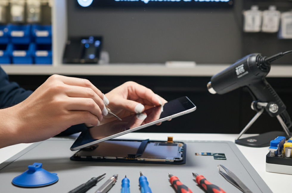 Close-up of a technician repairing an iPad screen in a professional repair shop in Brampton, showcasing precision tools and expertise, representing reliable iPad repair services.